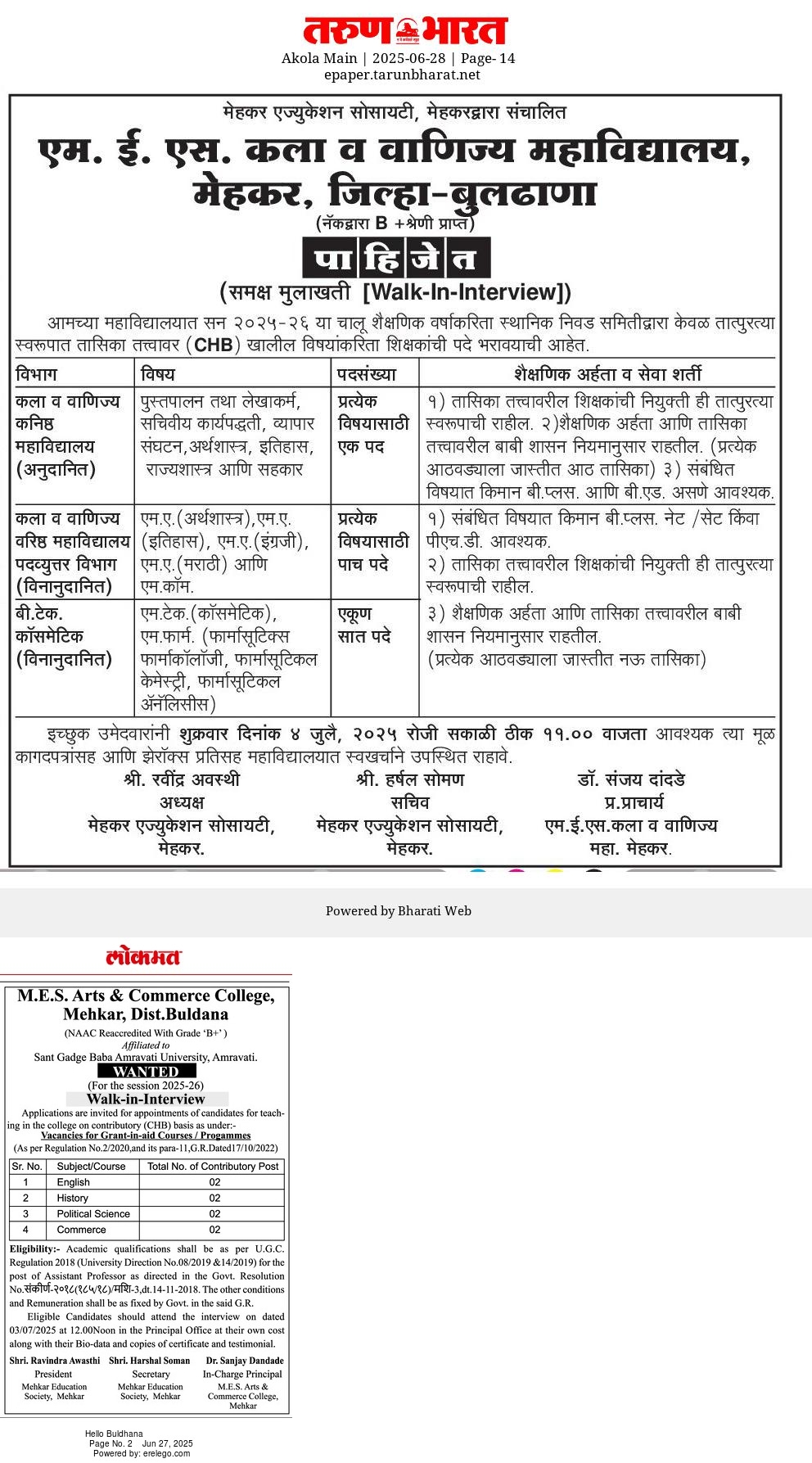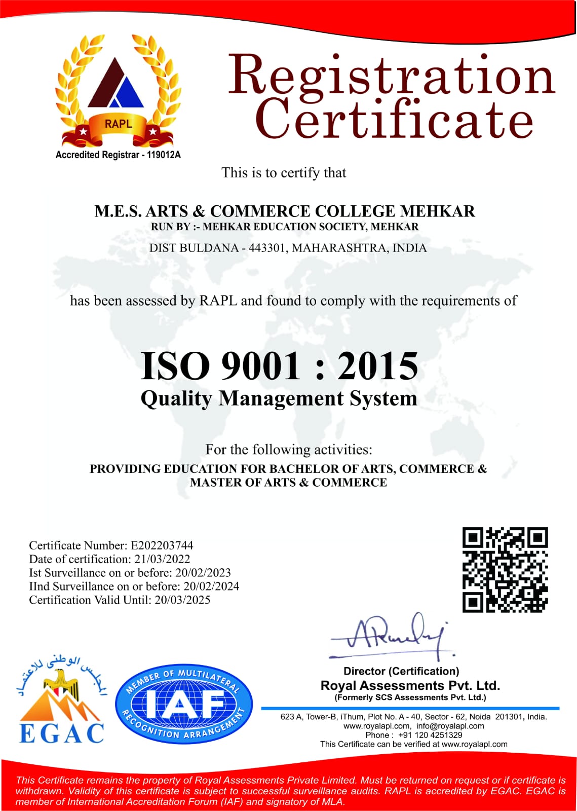 M. E. S. Arts And Commerce College, Mehkar District Buldhana (Maharashtra) was established in 1961 under the Mehkar Education Society Mehkar Dist. Buldhana (Maharashtra) is a profound educational movement offering K.G. To P.G. education since last 59 years to the rural students of Mehkar region. The M. E. S. Arts And Commerce College, Mehkar District Buldhana (M.S.) is Grant-in-aid College located in rural area of Buldhana district. The college is affiliated to Sant Gadge Baba Amravati University, Amravati (Maharashtra), a state university.